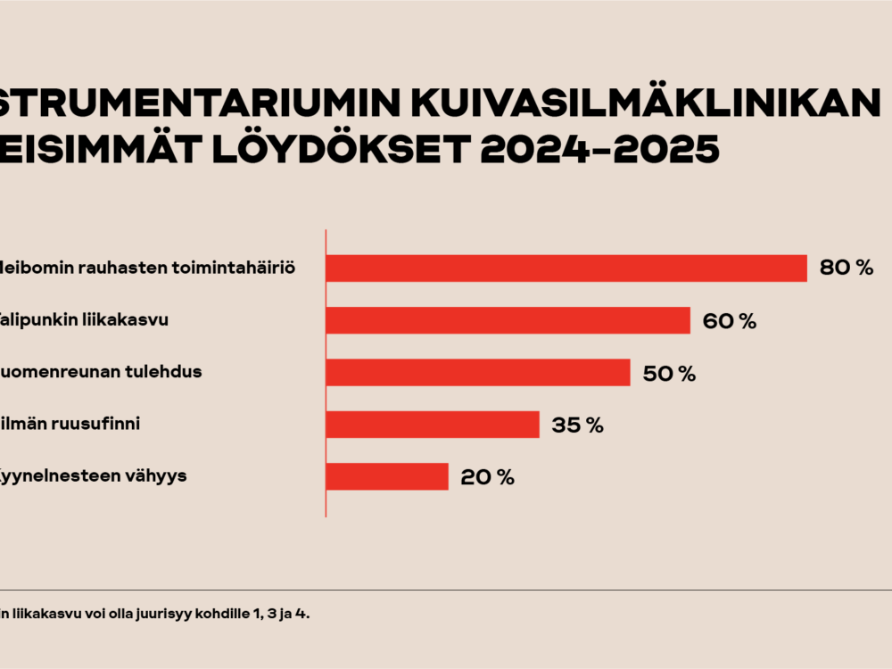 – Yli 45-vuotiaat tarvitsevat usein lähityöskentelyyn avuksi sopivia lähityöskentelylaseja. Sopivasti mitoitetut lähityöskentelylasit sekä mahdollisesti havaitun ja oireita aiheuttavan piilo- tai ilmikarsastuksen korjaus sopivilla silmälaseilla helpottavat usein huomattavasti työskentelyä. Riittävät tauot lähityöskentelyssä ovat myös tärkeitä. Hyvä ohje on pitää 20 sekunnin tauko 20 minuutin välein ja kohdistaa katsetta siksi ajaksi rennosti kauemmaksi.