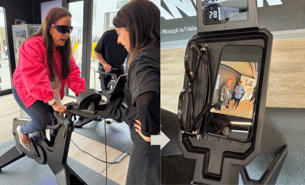 Hän istuu kuntopyörän päälle ja alkaa polkea. Onhan sitä urheilulaseja testatessa päästävä sporttiseen tunnelmaan.
