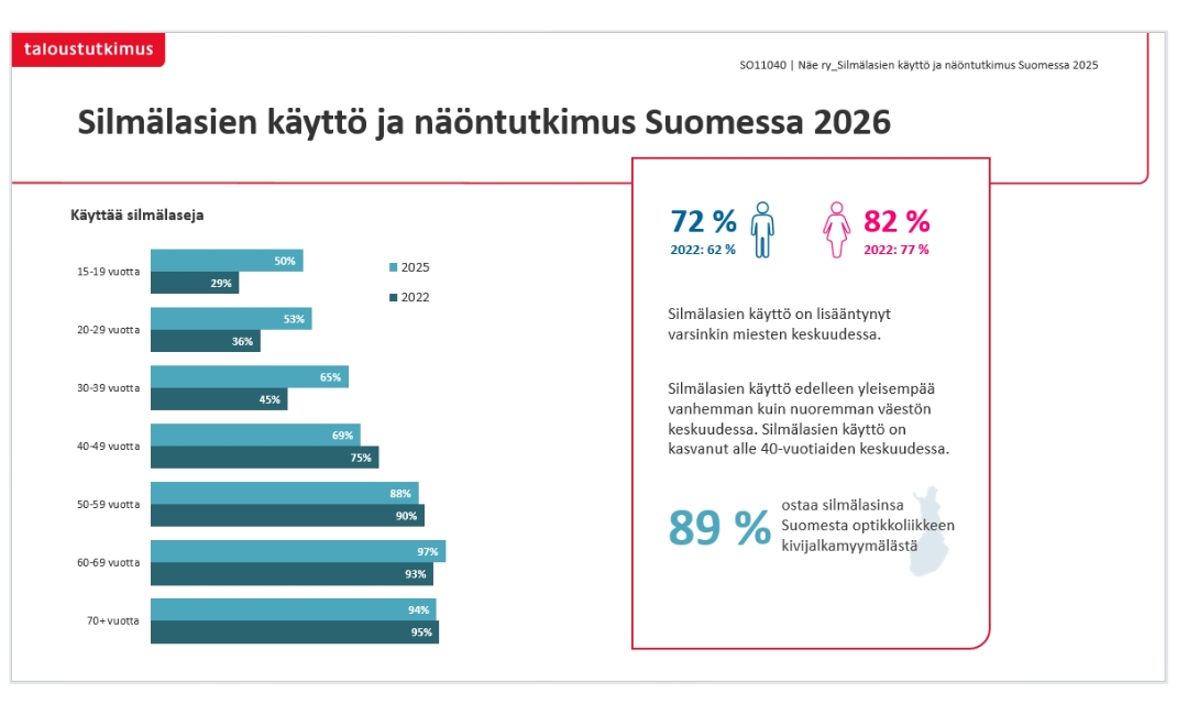 Tuoreen Silmälasien käyttö ja näöntutkimus Suomessa -tutkimuksen mukaan silmälasien jatkuva käyttö on noussut 55 prosenttiin (2022: 51 %). Silmälasien käyttö on edelleen yleisempää vanhemman kuin nuoremman väestön keskuudessa. Tutkimukseen vastanneista 60–69-vuotiaista lähes kaikki käyttävät silmälaseja (97 %), ja käyttö alle 40-vuotiaiden keskuudessa on kasvanut selvästi. Kasvu painottuu erityisesti miehiin, joiden silmälasien käyttö on lisääntynyt suhteellisesti eniten.